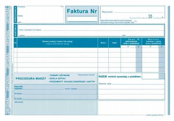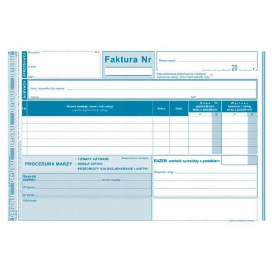 - Format: A5 - Rodzaj papieru: samokopiujący - Zastosowanie: faktury i inne dokumenty wynikające z przepisów o podatku od towarów i usług - Oprawa: bloczek 80 kartek - Druk: jednostronny (oryginał + kopia)