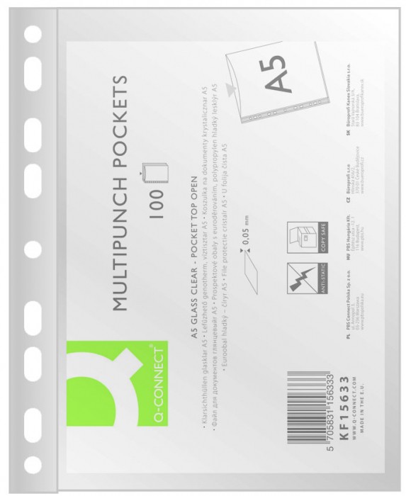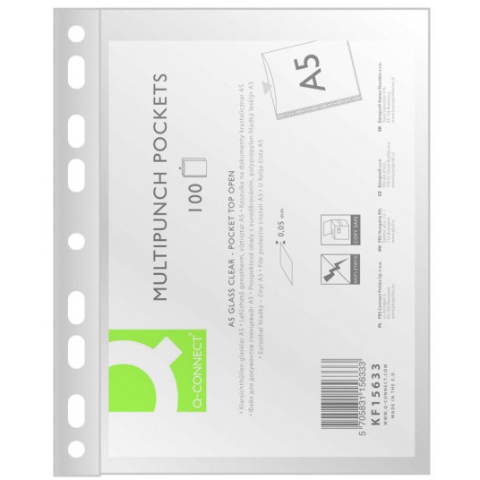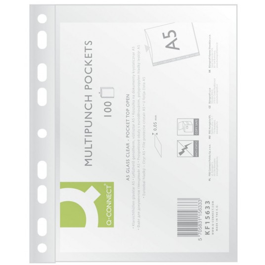 - Wykonane z miękkiej, gładkiej folii polipropylenowej o grubości 50µm - Krystaliczne, transparentne - Otwarte na górze - Antyelektrostatyczne - Odpowiednie do dokumentów w formacie A5 - Ilość dziurek do wpięcia: 9 - Rozmiar: 174x215mm - 100 sztuk w j.s. - Kolor transparentny