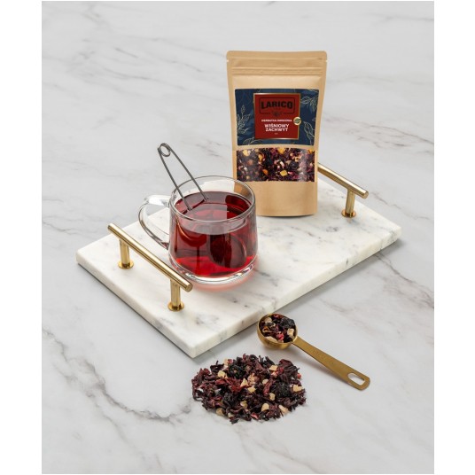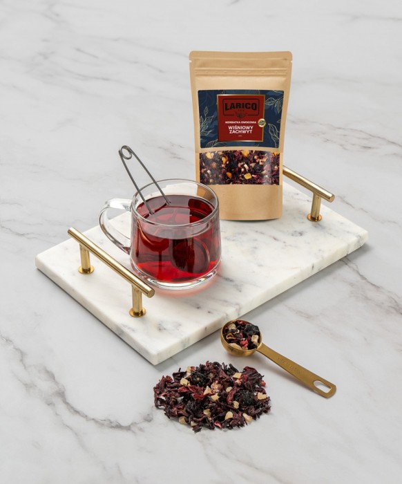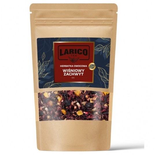 - Herbatka owocowa Larico Wiśniowy Zachwyt to mieszanka owoców wiśni, ananasa z płatkami hibiskusa