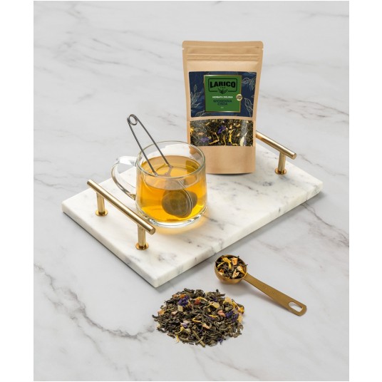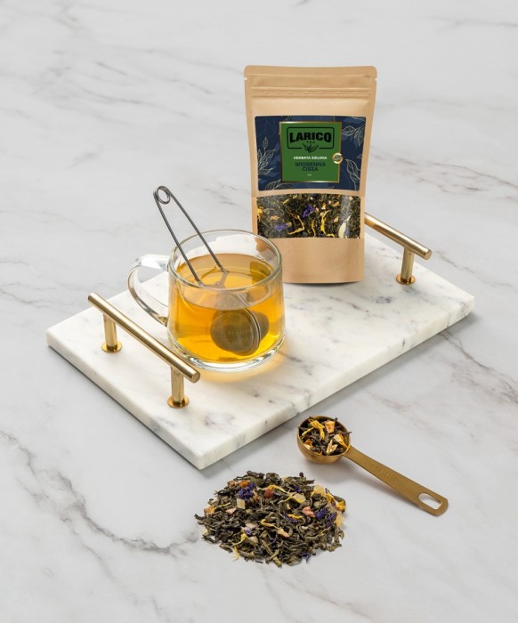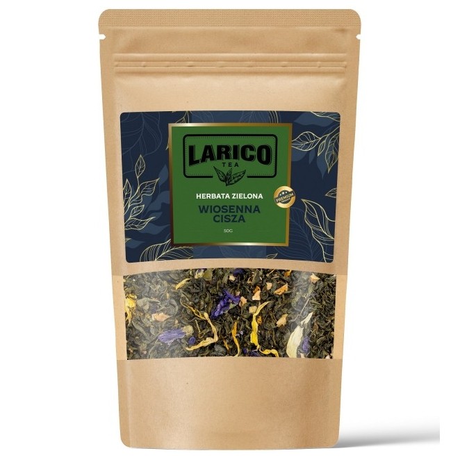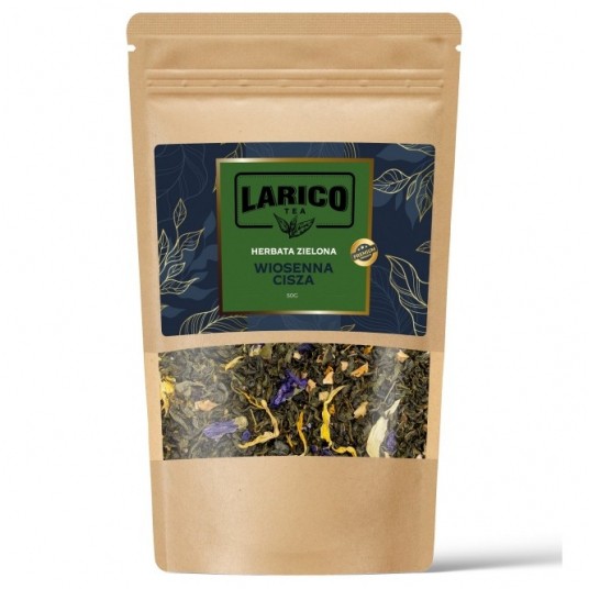 - Zielona herbata sypana Larico Wiosenna Cisza to zielona herbata liściasta z dodatkiem kawałków owoców, płatków ślazu, nagietka i słonecznika