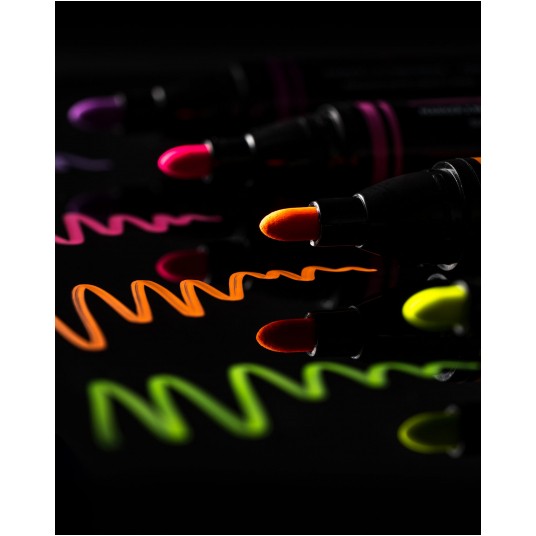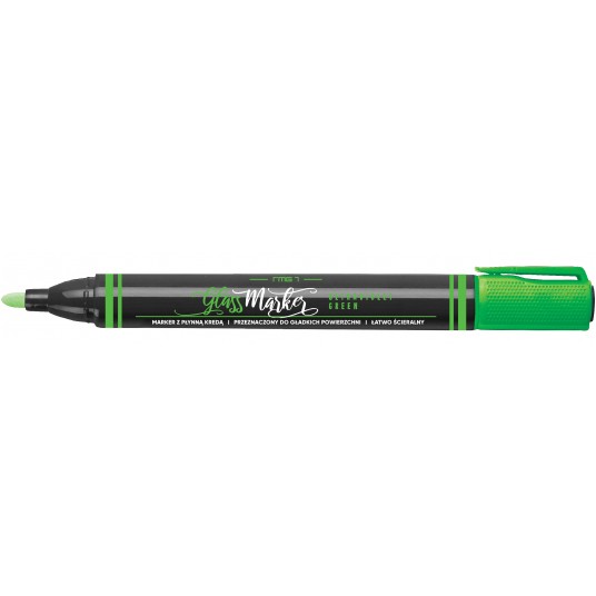 - Marker do szkła RMG-1 to kreda w płynie nie tylko dla dzieci - Niech nie zmyli cię nazwa, bo szkło to tylko jeden z kilkunastu materiałów na których płynna kreda może się na chwilę rozgościć. Dlaczego na chwilę? Dlatego, że w razie potrzeby wystarczy sucha szmatka, żeby rysunek, napis czy znacznik zniknął bez śladu - Marker kredowy z płynnym tuszem kredowym to uniwersalny marker do pisania i malowania po szkle i innych gładkich powierzchniach - Aby zacząć pisać trzeba przycisnąć końcówkę do powierzchni po której będziemy pisać w pozycji pionowej, tak aby umożliwić końcówce markera napełnienie się tuszem - Pozwala na niebanalną i oryginalną prezentację reklam i ważnych treści, doskonały do szklanych sklepowych witryn, okien restauracji, luster lub innych gładkich powierzchni - Okrągła, fibrowa końcówka pisząca o szerokości 4 mm - Linia pisania 1,5-3 mm - Tusz świecący pod lampą UV (tylko kolory żółty, niebieski, różowy, zielony, fioletowy i pomarańczowy) - Tusz nie pylący - Zmywalny - Do gładkich powierzchni - do szkła, ale również do tworzyw sztucznych, płytek, tablic suchościeralnych, potykaczy, itp. - Bezpieczny dla dzieci - Kolor: zielony