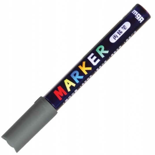 - Marker akrylowy przeznaczony do zdobienia i malowania na większości powierzchniach, takich jak: drewno, tektura, papier, płótno, szkło, guma, plastik, stal, kamień, płótno, styropian - Wodoodporny i szybkoschnący - Bardzo odporny na światło słoneczne, charakteryzuje się wysoką przyczepnością do podłoża - Grubość kreski 1-2 mm - Dostępny w 30 kolorach - Kolor: ciemnoszary