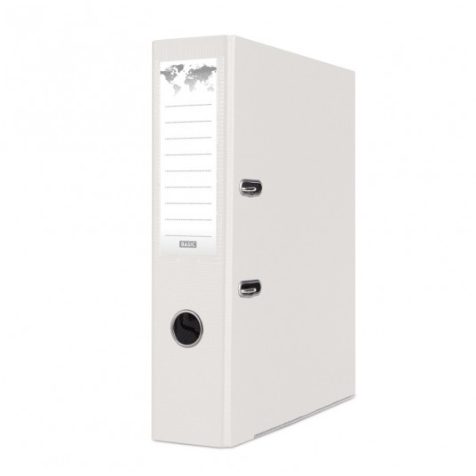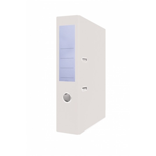 segregator z niklowanym mechanizmem dźwigniowym wykonany z kartonu o grubości 2,0mm i gramaturze 1200gsm, wyposażony w dolną listwę wzmacniającą pokryty matową folią polipropylenową (140µm) wewnątrz wyklejka papierowa z indeksem, tabelą formatów, mapą stref czasowych oraz miejscem na notatki dwustronna, wymienna etykieta grzbietowa w kratkę wzmocniony otwór na palec szerokość grzbietu: 75mm wymiary: 75x320x285mm 2 lata gwarancji na mechanizm dźwigniowy kolor: biały