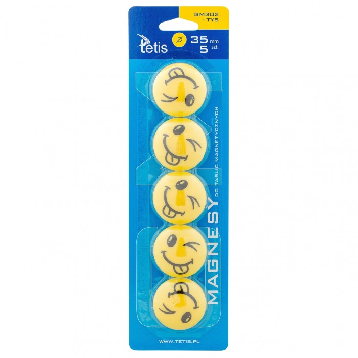- Magnesy Tetis są niebywale mocne i trwałe, zapewniają prosty i praktyczny sposób przymocowania dokumentu lub notatki do powierzchni magnetycznych - Doskonałe do tablic i innych powierzchni magnetycznych - Pakowane na blistrze - Średnica: 35 mm - Kolor: żółty - Wzór: z językiem - Ilość: 6 sztuk