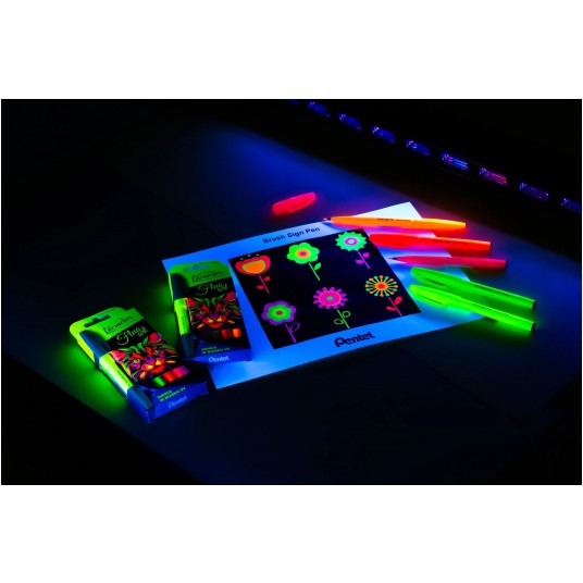- Specjalny tusz, który reaguje na światło ultrafioletowe, nadaje pismu jaskrawe, neonowe barwy
