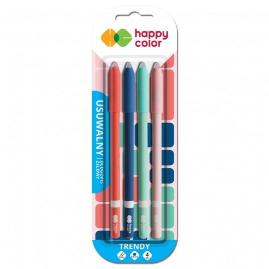 - Zestaw 4 wymazywalnych długopisów żelowych z kolekcji TRENDY inspirowanej najnowszymi kolorami świata mody i designu wnętrz, wykonanej w wyjątkowej technologii druku i barwienia - Kolekcja dedykowana dla wymagających kolekcjonerów niepowtarzalnych kolorów - Dzięki unikalnej formule tuszu napisany tekst można łatwo wymazać - Gumka do wycierania znajduje się na skuwce - Grubość linii pisania: 0.5 mm - Kolor wkładu niebieski (crystal blue) - Na wymienne wkłady Standard A - 4 sztuki w zestawie