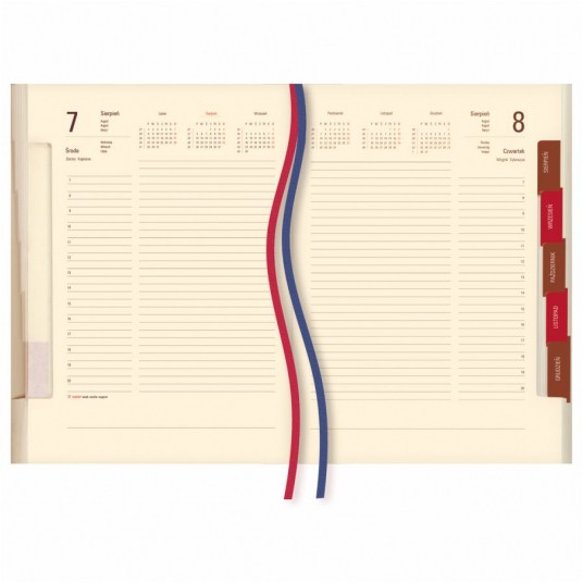 - Układ kalendarium: 1 dzień - 1 strona + dodatkowe strony po zakończeniu miesiąca