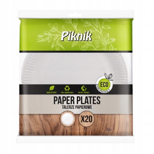 - Talerze papierowe Piknik są wykonane wyłącznie z najwyższej jakości surowców - Posiadają niezbędne atesty dopuszczające do kontaktu z żywnością - 20 sztuk w opakowaniu - Średnica: 23 cm - Kolor: biały