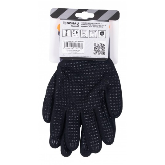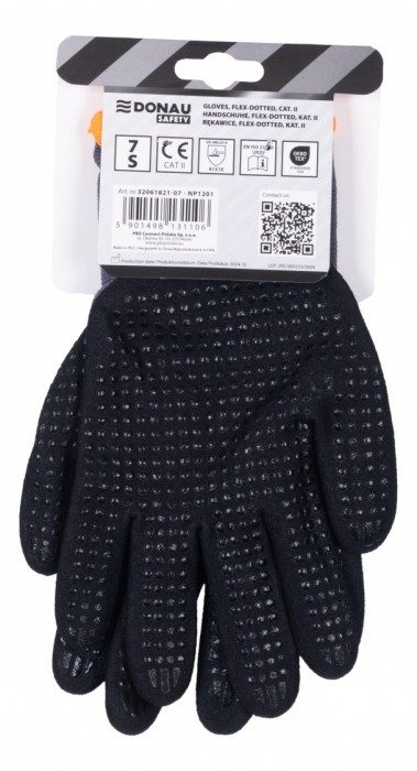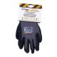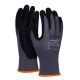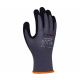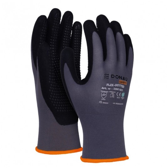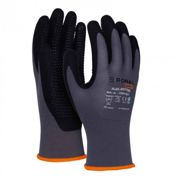 - Rękawice wykonane z dobrej jakości dzianiny nylonowej z elastanem w kolorze szarym, powleczone w części chwytnej ultradrobną pianką nitrylową z nakropieniem w kolorze czarnym