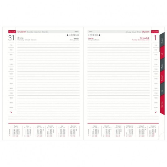 - Terminarz książkowy formatu A4 (201 x 280 mm), objętość 368 stron. Język: PL/EN/DE/ES