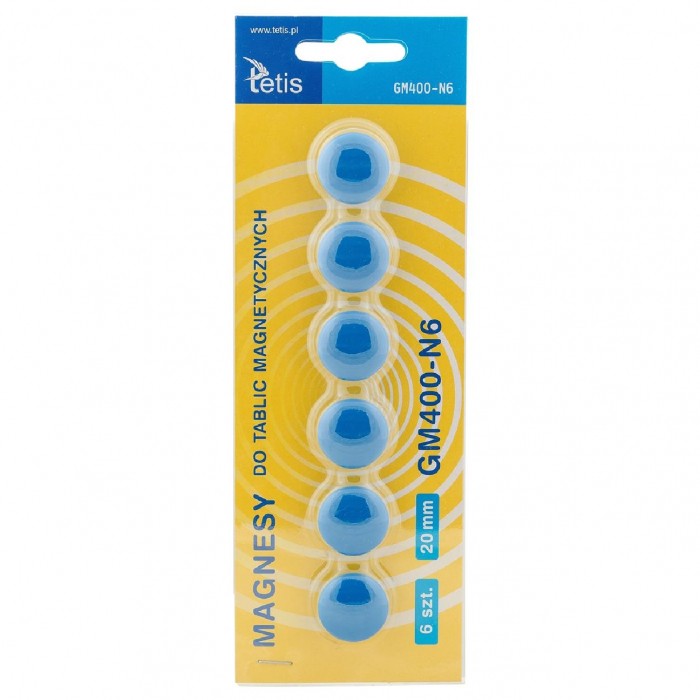 - Magnesy Tetis są niebywale mocne i trwałe, zapewniają prosty i praktyczny sposób przymocowania dokumentu lub notatki do powierzchni magnetycznych - Doskonałe do tablic i innych powierzchni magnetycznych - Pakowane na blistrze - Średnica: 20 mm - Kolor: niebieski - Wzór: gładkie - Ilość: 6 sztuk