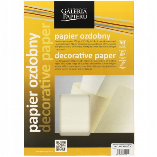 - Papier 100g/m2 dwustronnie metalizowany - Do druku korespondencji, insertów do zaproszeń, zaproszeń, ofert handlowych etc. - Polecany do drukarek atramentowych i laserowych - Dostępny w kolorach: biały, kremowy i błękitny - Opakowanie 50 arkuszy - Format: A4