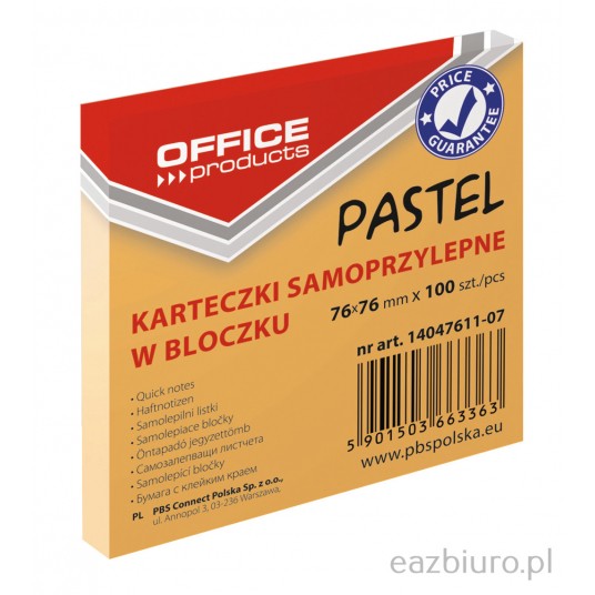 - Karteczki samoprzylepne w najpopularniejszym formacie - Ilość karteczek: 100 w rozmiarze 76x76mm - Gramatura: 70gsm - Klej usuwalny za pomocą wody - Wykonane z papieru (100% pulpa drzewna) - Kolor pomarańczowy