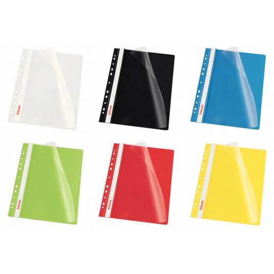 - Skoroszyt formatu A4 z paskiem multiperforowanym umożliwiającym wpięcie do każdego rodzaju segregatora - Tylna okładka kolorowa, przednia - przezroczysta - Wysuwany, papierowy pasek do opisu zawartości - Wykonany z folii PCV - Pakowany po 10 szt. w folii