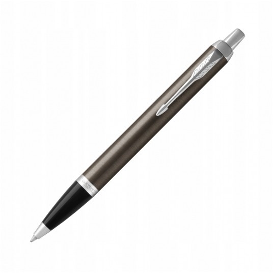 Na szlifowanej, mosiężnej bazie położono kilkanaście warstw satynowego lakieru w kolorze espresso. Pierścienie chromowane i polerowane. Część przednia wykonana z połyskującego, czarnego tworzywa sztucznego. Wyposażony w pstrykany system wysuwania wkładu. Idealny długopis Parker na prezent.