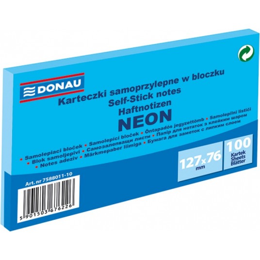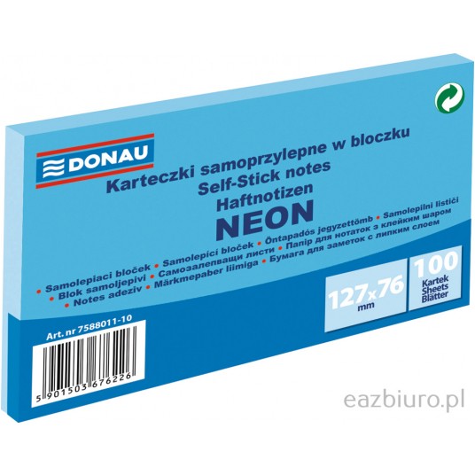 - Uniwersalne kolorowe karteczki, idealne do przekywania wiadomości - Ilość karteczek: 1x100 w rozmiarze 127x76mm - Gramatura: 70gsm (+/- 4%) - Klej umieszczony wzdłuż dłuższego boku - Klej usuwalny za pomocą wody - Posiada oznaczenie Zielony Punkt" (Der Grüne Punkt) - oznaczający udział w systemie recyklingu i odzysku odpadów wynikający z przepisów prawa polskiego i UE - Indywidualnie zabezpieczony folią z charakterystycznym czerwonym paskiem ułatwiającym otwieranie - Kolor neon niebieski
