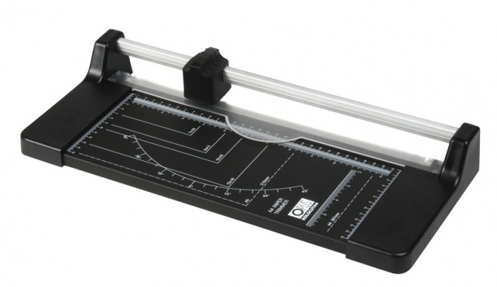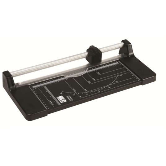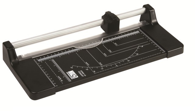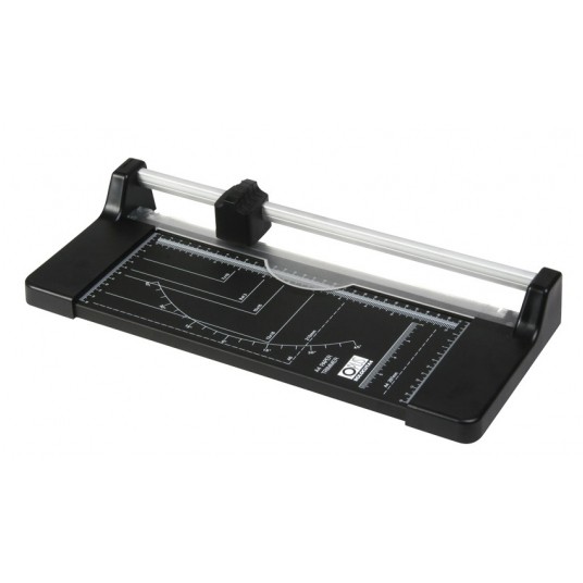 - Posiada solidny nóż krążkowy, plastikową listwę docisku