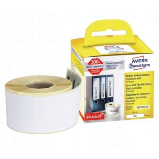 - Etykiety kryjące na segregatory Avery Zweckform w rolce do drukarek termicznych - Są w 100% kompatybilne z: Dymo LW310; Dymo LW330T, LW400 Seria, LW450 Seria; Seiko Smart Label Printer; Brother TD-4100N - Rozmiar: 38 x 190 mm - Klej: trwały - 1 rolka/op. - Kolor: białe - Etykiety na segregatory całkowicie zakrywają stare oznaczenia, dzięki technologii BlockOut - Gwarancja niezawodnego zadruku i pewnego przylegania etykiety - Ilość etykiet/opakowanie: 110