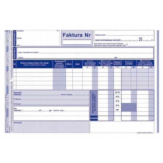 - Format: A5 - Rodzaj papieru: samokopiujący - Zastosowanie: faktury i inne dokumenty wynikające z przepisów o podatku od towarów i usług - Oprawa: bloczek 80 kartek - Druk: jednostronny (oryginał + kopia)