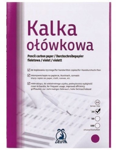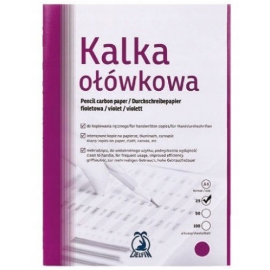 - Kalka ołówkowa powlekana fioletową masą, służy do sporządzania odbitek ręcznych, jest wydajna i wygodna w użyciu. - Opakowanie zawiera 25 arkuszy w formacie A4.