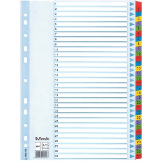- Kartonowe numeryczne i alfabetyczne - Wykonane z grubego, białego kartonu 160 g/m2 - Kolorowe indeksy wzmocnione folią Mylar (w 5 kolorach) - Z kartą informacyjno - opisową, której pasek z perforacją jest wzmocniony folią - Multiperforowane - pasują do każdego segregatora