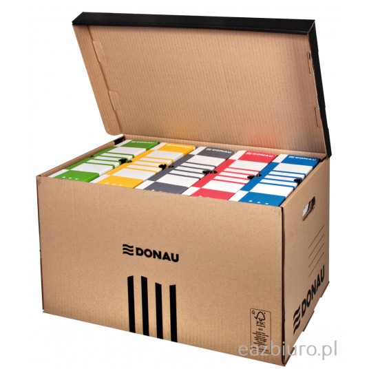 - Wykonane z trójwarstwowej tektury falistej o gramaturze 450gsm - Produkt bezkwasowy, wskaźnik pH ok. 7,5 - Typ fali: C - Mieści np. 6 pudełek 80mm lub 5 pudełek 100mm lub 4 pudełka 120mm lub 2 pudełka 155mm+1 pudełko 200mm lub 2 pudełka 200mm + 1 pudełko 100mm - Wzmocnione dno i uchwyty pozwalają przenosić nawet najbardziej dociążone segregatorami/pojemnikami pudło - Zintegrowana klapa otwierana od góry ułatwia dostęp do dokumentów bez konieczności wyjmowania pudełek z pudła zbiorczego - Kompatybilne z pudłem wzmocnionym otwieranym z przodu - specjalne otwory w dnie i wypustki w klapie ułatwiają składowanie pudeł piętrowo - Składane, proste w montażu - Certyfikat FSC® gwarantuje, że surowiec potrzebny do produkcji wyrobu pochodzi z lasów zarządzanych w odpowiedzialny sposób; promuje on trwałą gospodarkę leśną opartą o najwyższe światowe standardy w dziedzinie ochrony przyrody i gwarantuje legalność pochodzenia surowca - Udźwig do 26kg - Wymiary zewnętrzne: 558x370x315mm (± 5mm) - Kolor brązowy