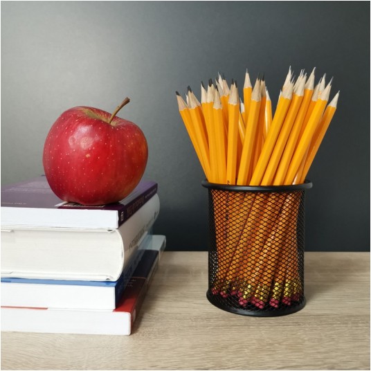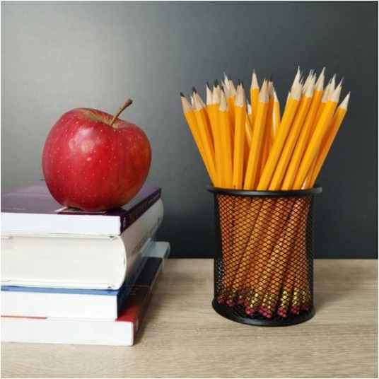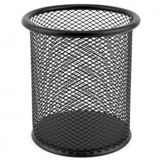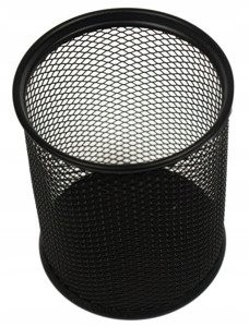 - Metalowy kubek na biurko służący do przechowywania artykułów piśmiennych.