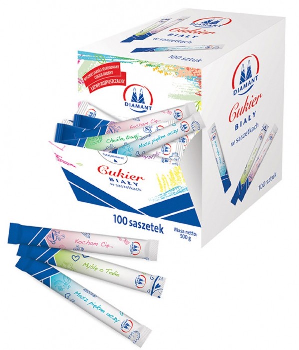 - Jedna saszetka to jedna porcja cukru, idealna do słodzenia gorących napojów, np. kawy lub herbaty