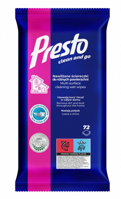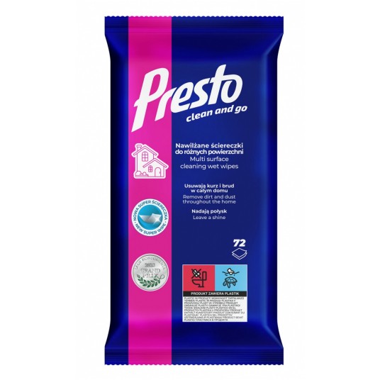 - Ściereczki nawilżane Presto do różnych powierzchni przeznaczone są do czyszczenia mebli laminowanych, powierzchni plastikowych oraz z innych tworzyw sztucznych