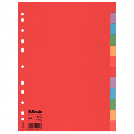 - 12 kolorowych przekładek ułatwiających sortowanie - 11 uniwersalnych otworów umożliwiających wpinanie do segragatora - Format A4 - Mocny karton o gramaturze 160 gsm - Wykonane z wysokiej jakości kartonu pochodzącego z odzysku - Posiadają certyfikat Blue Angel