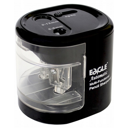 - Dwuotworowa, do ołówków o średnicy 6–8 i 9–12 mm - Bezpieczny dla dzieci przełącznik rozmiaru ołówka rozmiaru ołówka - Trwały mechanizm z dwoma wysokiej jakości ostrzami ze stali węglowej ze stali węglowej - Ostrza wymienne - Na baterie AA (4 szt., nie dołączono) - Stabilna podstawa - 3 lata gwarancji - instrukcja obługi