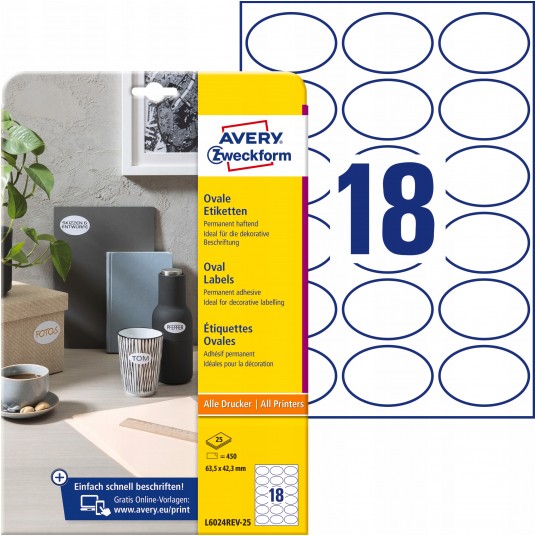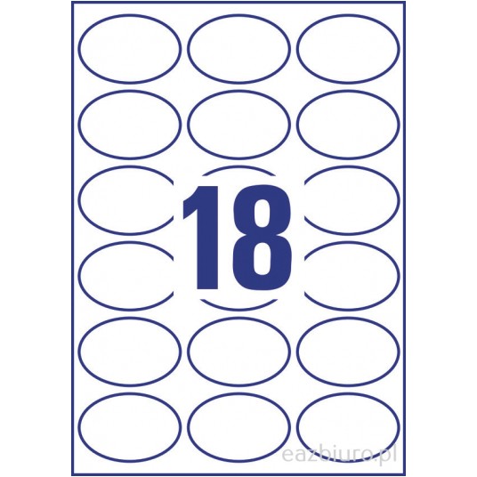Usuwalne etykiety owalne - Posiadają wyrazisty i przyciągający uwagę kształt. - Idealnie sprawdzają się jako etykiety promocyjne, do czasowego oznaczania lub ozdabiania produktów oraz do dodawania nowych lub specyficznych informacji na opakowaniu. - Są odpowiednie także do ogólnego oznaczania w biurze oraz w domu. - Można je łatwo usunąć lub przekleić – nie pozostawiają śladów kleju. - Są przyjazne dla środowiska - posiadają certyfikat FSC®, czyli zostały wykonane z papieru pochodzącego z ekologicznie zarządzanych zasobów leśnych. - Gwarancja braku zacięć podczas wydruku oraz wyraźny wydruk bez rozmazywania. - Etykiety przeznaczone do zadruku w drukarkach atramentowych, laserowych, kolorowych laserowych oraz kopiarkach. - Darmowe i ławe w użyciu szablony oraz oprogramowanie do projektowania i wydruku etykiet jest dostępne na stronie: www.avery-zweckform.pl - Ilość etykiet/arkusz: 18 - Ilość arkuszy: 25 - Ilość etykiet/opakowanie: 450