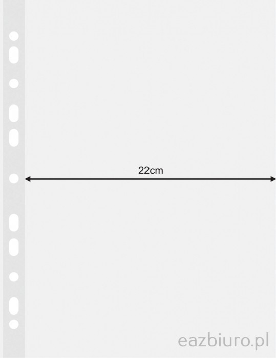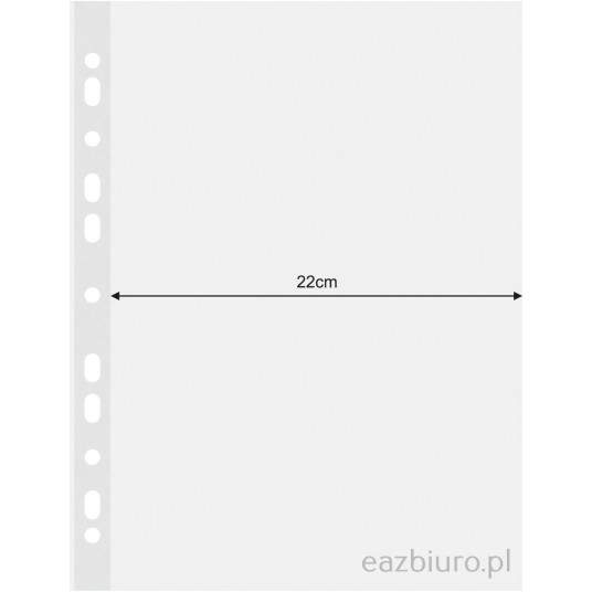 - Wykonane z gładkiej, ekologicznej folii polipropylenowej o grubości 120µm - Posiada Zielony Punkt (Der Grüne Punkt) - udział w systemie recyklingu i odzysku odpadów wynikający z przepisów prawa polskiego i UE - Specjalnie wzmocniony brzeg - Wersja poszerzana - format szerszy niż A4 pozwalający przechowywać katalogi lub znaczną ilość dokumentów (pojemność do120 kartek A4) - Krystaliczne, transparentne - Otwarte na górze - Antyelektrostatyczne - Ilość dziurek do wpięcia: 11 - Rozmiar: 238x304mm - Kolor transparentny