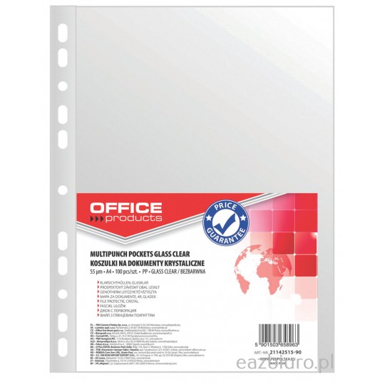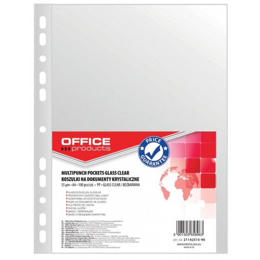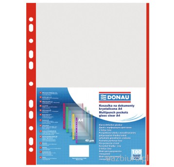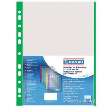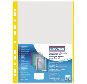 - Wykonane z miękkiej, gładkiej folii polipropylenowej o grubości 55µm - Posiada właściwości antyrefleksyjne - Krystaliczne, transparentne - Wzomocniony brzeg - Otwarte na górze - Antyelektrostatyczne - Odpowiednie do dokumentów w formacie A4 - Ilość dziurek do wpięcia: 11 - Rozmiar: 232x306mm - 100 sztuk w j.s. - Kolor transparentny