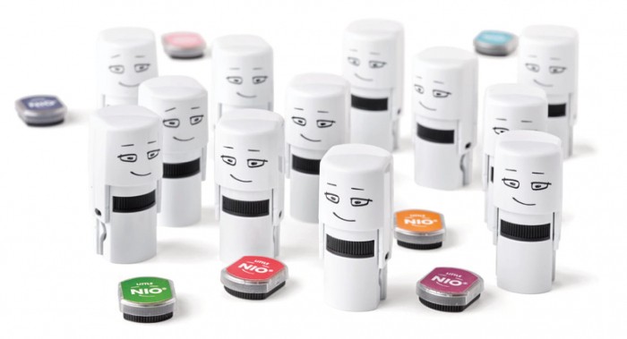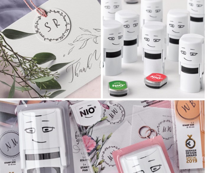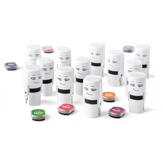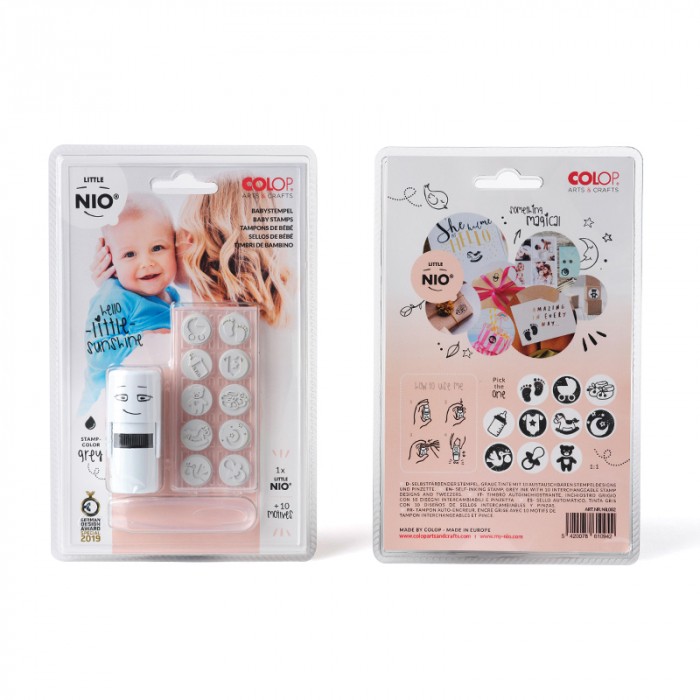 - Pieczątka Little Nio - 10 wymiennych wzorów - Pęseta ułatwiająca montaż wzorów - Tusz w kolorze grafitowym