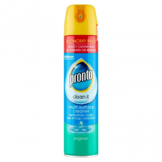- Pronto Multi surface przeciw kurzowi w aerozolu delikatnie czyści większość twardych powierzchni bez uszkodzeń, usuwając kurz i brud bez pozostawiania smug - Odpowiednie do: granitu, kwarcu, chromu, stali nierdzewnej, szkła, luster, zabezpieczonego drewna, laminatu drzewnego, tworzyw sztucznych, elektroniki i innych powierzchni - Usuwa: kurz, odciski palców i smugi - Pojemność 300 ml