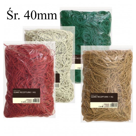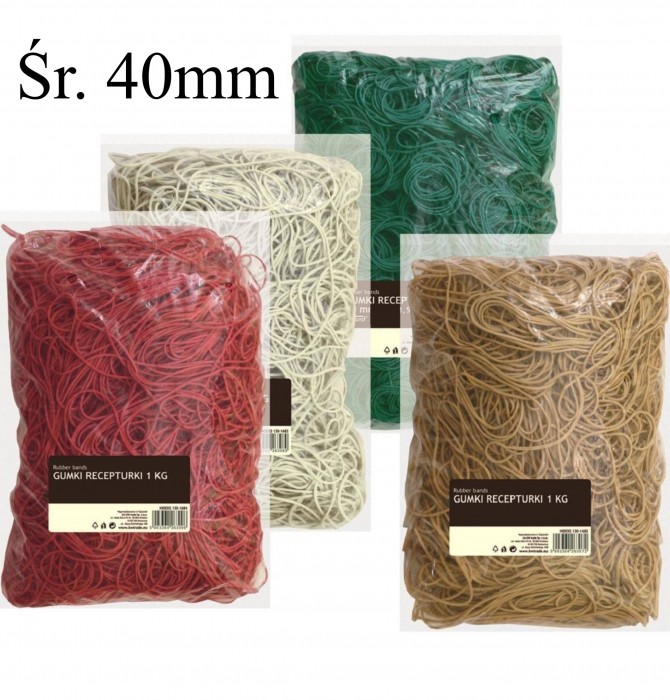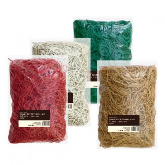 – elastyczne gumki – dostępne w 4 kolorach: naturalnym, czerwonym, zielonym oraz białym – pakowane w woreczki – rozmiar: 1,5 x 1,5 mm – średnica: 40 mm – długość po złożeniu: 7 cm – opak. 1 kg