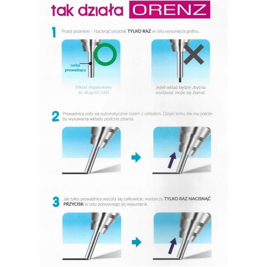 - Ołówek automatyczny Orenz PP503 to ultra precyzyjne pisanie bez konieczności wysuwania grafitu podczas pisania - Rewolucyjny system zastosowany w ołówku sprawia iż podczas pisania grafit nie łamie się - Naciskasz raz, piszesz non stop - Model zarówno dla profesjonalistów, jak i uczniów czy studentów