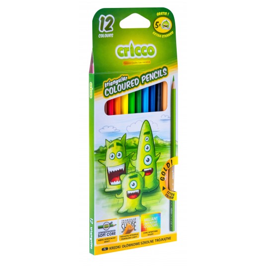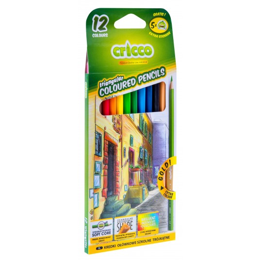 - Kredki ołówkowe 12 kolorów o trójkątnym kształcie. - Ergonomiczny kształt umożliwia pewne trzymanie i ułatwia rysowanie. - Lakierowane obudowy kredek zgodnie z kolorem grafitu. - Wszystkie kredki oryginalnie zatemperowane i gotowe do użycia. - Pakowane w kolorowe kartoniki z okienkiem i zawieszką. - Dodatkowo złoty i cielisty kolor oraz ekstra naklejki w każdym pudełku.