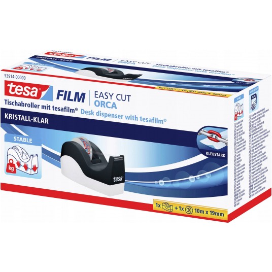 - Antypoślizgowy dyspenser biurkowy tesa Easy Cut® ORCA jest połączeniem wysokiej funkcjonalności i nowoczesnego wzornictwa - Podczas gdy jego masa zapewnia stabilność, ząbkowane ostrze sprawia, że odcięcie taśmy samoprzylepnej staje się naprawdę dziecinnie proste - Podkładka ochronna umieszczona na podstawie zapobiega uszkodzeniu powierzchni - Dyspenser biurkowy przyda się podczas wielu prac wykonywanych w domu oraz w biurze, takich jak pakowanie prezentów czy zaklejanie kopert - Co więcej, można go łatwo uzupełnić nową taśmą tesafilm® - Antypoślizgowy i stabilny - Ząbkowane ostrze "Easy Cut" do precyzyjnego odcinania taśmy - Prosta obsługa - Łatwe uzupełnianie i mocowanie rolki - Podkładka ochronna zapobiega zarysowaniu biurka przez podstawę - Odpowiedni do rolek o maksymalnym wymiarze 33 m x 19 mm - W zestawie z jedną rolką taśmy tesafilm® Crystal Clear - Kolor obudowy: czarno-biały