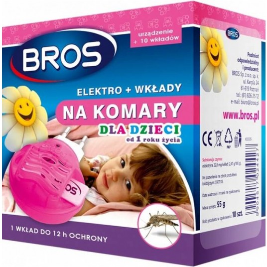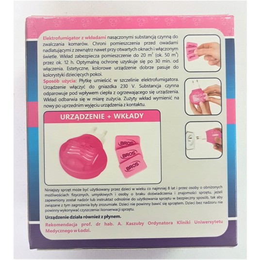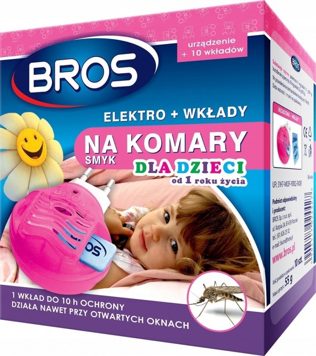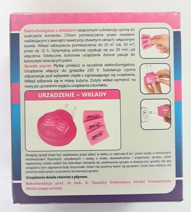 - Elektrofumigator z wkładami nasączonymi substancją czynną do zwalczania komarów - Chroni pomieszczenia przed owadami nadlatującymi z zewnątrz nawet przy otwartych oknach i włączonym świetle - Wkład zabezpiecza pomieszczenie do 20 m2 (ok. 50 m3) przez ok. 12 h - Optymalną ochronę uzyskuje się po 30 min. od włączenia - Estetyczne, kolorowe urządzenie dobrze pasuje do kolorystyki dziecięcych pokoi - Rekomendacja prof. dr hab. A. Kaszuby Ordynatora Kliniki Uniwersytetu Medycznego w Łodzi - Sposób użycia: Płytkę umieścić w szczelinie elektrofumigatora. Urządzenie włączyć do gniazdka 230 V. Substancja czynna odparowuje pod wpływem ciepła z ogrzewającego się urządzenia. Wkład odbarwia się w miarę zużycia. Zużyty wkład wymienić na nowy po uprzednim wyjęciu urządzenia z kontaktu