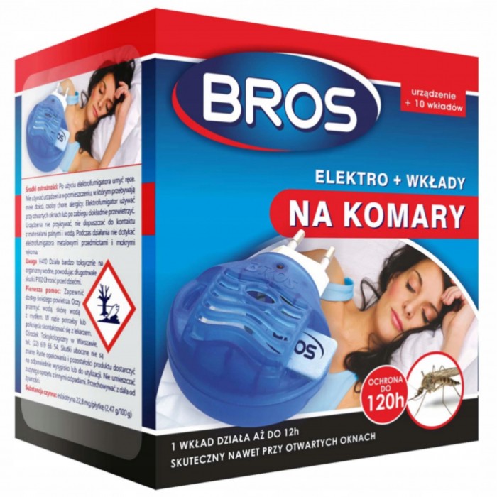 - Elektrofumigator z wkładami nasączonymi substancją czynną do zwalczania komarów i zabezpieczania pomieszczeń przed owadami nadlatującymi z zewnątrz - Działa nawet przy otwartych oknach i włączonym świetle - Wkład zabezpiecza pomieszczenie do 20 m2 (ok. 50 m3) - Optymalną ochronę uzyskuje się po 30 min. od włączenia - Urządzenie działa również z płynem - Sposób użycia: Płytkę umieścić w szczelinie elektrofumigatora. Urządzenie włączyć do gniazdka 230V. Substancja czynna odparowuje pod wpływem ciepła ogrzewającego się urządzenia. Wkład odbarwia się w miarę zużycia. Zużyty wkład wymienić na nowy po uprzednim wyjęciu urządzenia z kontaktu