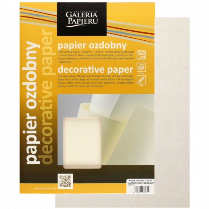 - Gładki - Format: A4 - Gramatura: 120g/m2 - Ilość: 50 arkuszy w opakowaniu - Dostępny w kolorach: jasnobeżowy i ciemnobeżowy - Polecany do drukarek atramentowych i laserowych - Papier do korespondencji biznesowej, insertów do zaproszeń, kart okolicznościowych, podziękowań, certyfikatów, które zostaną oprawione.