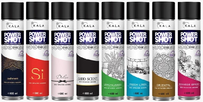 Neutralizator nieprzyjemnych zapachów, odświeżacz Kala POWER SHOT 600ml to produkt z rewolucyjnym sposobem dozowania, dzięki któremu jedno naciśnięcie wentyla (ok 1 sekunda) neutralizuje nieprzyjemne zapachy oraz aromatyzuje około 200 m3. W składzie POWER SHOT obecne są substancje czynne, dzięki którym nieprzyjemne zapachy są neutralizowane a nie jak w przypadku większości odświeżaczy przykrywane. Wraz z neutralizacją nieprzyjemnych zapachów POWER SHOT zapewnia również aromatyzację przestrzeni jednym z 6 dostępnych w gamie POWER SHOT zapachów.