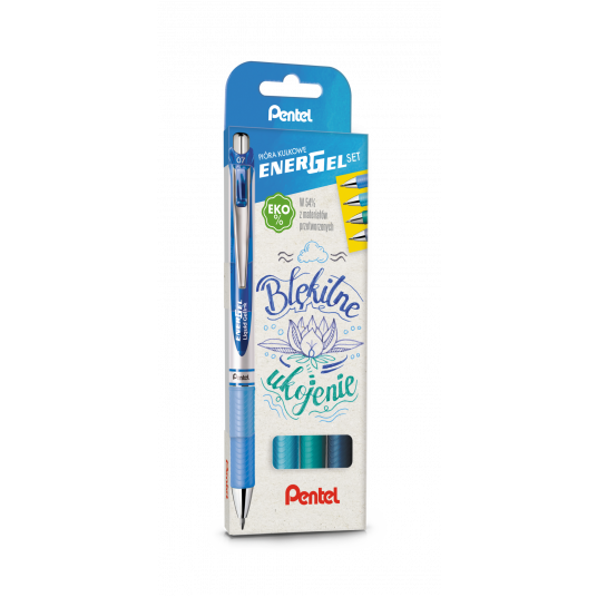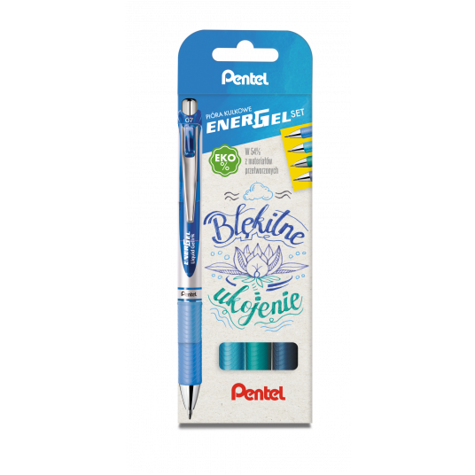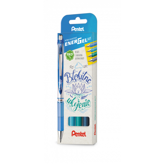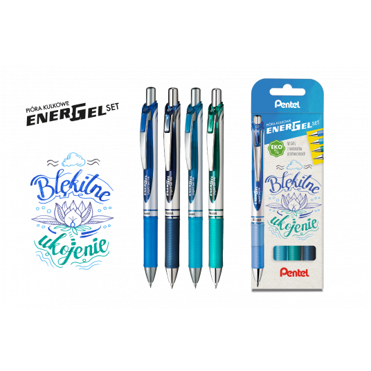 - Zestaw 4 piór kulkowych do pisania i tworzenia innowacyjnych ilustracji - EnerGel Set to kolorystyczne kompozycje z myślą o nadaniu barw Twoim notatkom - Nasze zestawy to idealny pomysł na prezent - Stworzone z myślą o osobach, które lubią mieć pod ręką intensywne kolory - Błękitne ukojenie: niebieski, ciemnoniebieski, błękitny, turkusowy - Rewelacyjny tusz żelowy przyczynia się do podwyższania komfortu pisania - Nie rozmazuje się i nie brudzi, wysycha błyskawicznie - Pióro idealne dla osób leworęcznych - Metalowy klip i niezawodny system przyciskowy - Wyposażone w gumowy uchwyt, który działa antypoślizgowo - Model ekologiczny, na wkłady wymienne LR7 (0,7 mm) lub LRN5 (0,5mm) - Dbając o zrównoważony rozwój nasze pióra kulkowe BL77 sąwykonane w 54% z materiałów przetworzonych pomijając części zużywające się np. wkłady